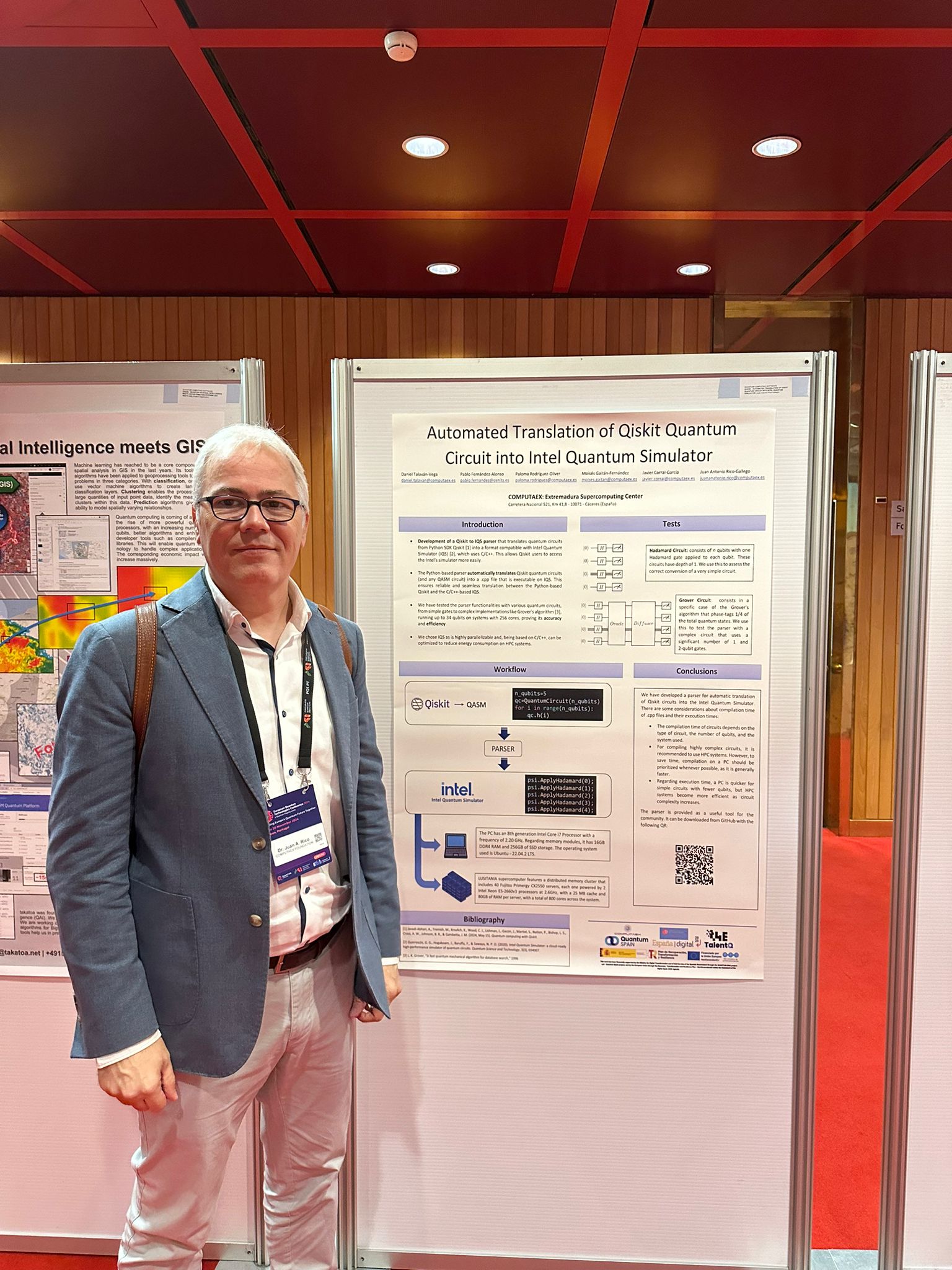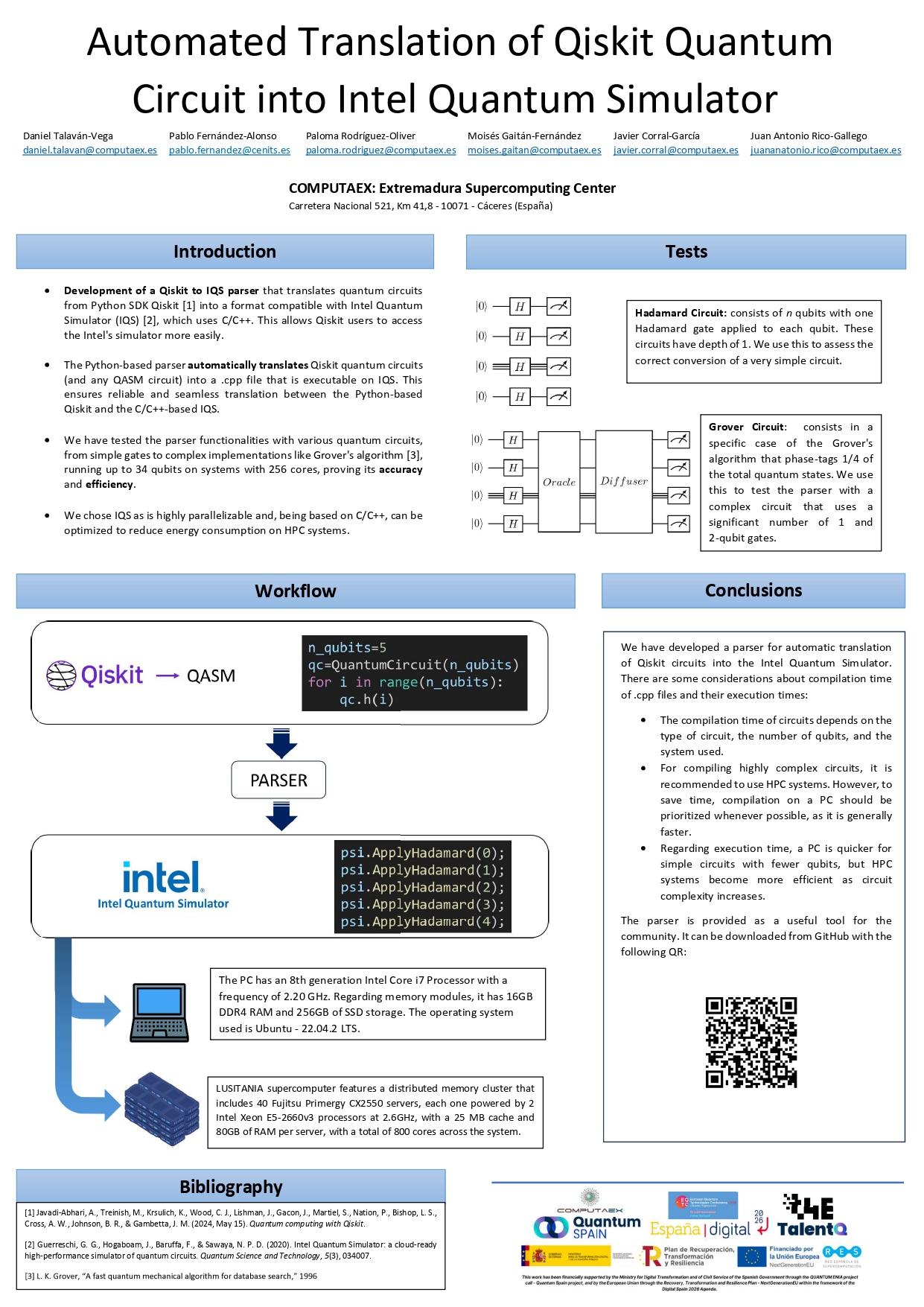 Del 18 al 20 de noviembre se celebra en Lisboa la Conferencia Europea de Tecnologías Cuánticas (EQTC 2024), un encuentro dirigido a científicos e investigadores europeos especializados en todos los campos de la tecnología cuántica: comunicación y redes cuánticas, computación, simulación, detección y metrología. El espacio reúne a especialistas y tecnólogos que darán a conocer los últimos avances del sector tecnológico. Lisboa acoge este año la conferencia bajo el lema “Construyendo juntos el futuro cuántico de Europa”. El Director General de COMPUTAEX, el Centro de Supercomputación de Extremadura, asiste presentando los resultados del trabajo Automated Translation of Qiskit Quantum Circuit into Intel Quantum Simulator, realizado junto a los investigadores de COMPUTAEX, D. Daniel Talaván, Dña. Paloma Rodríguez y el Dr. Javier Corral.